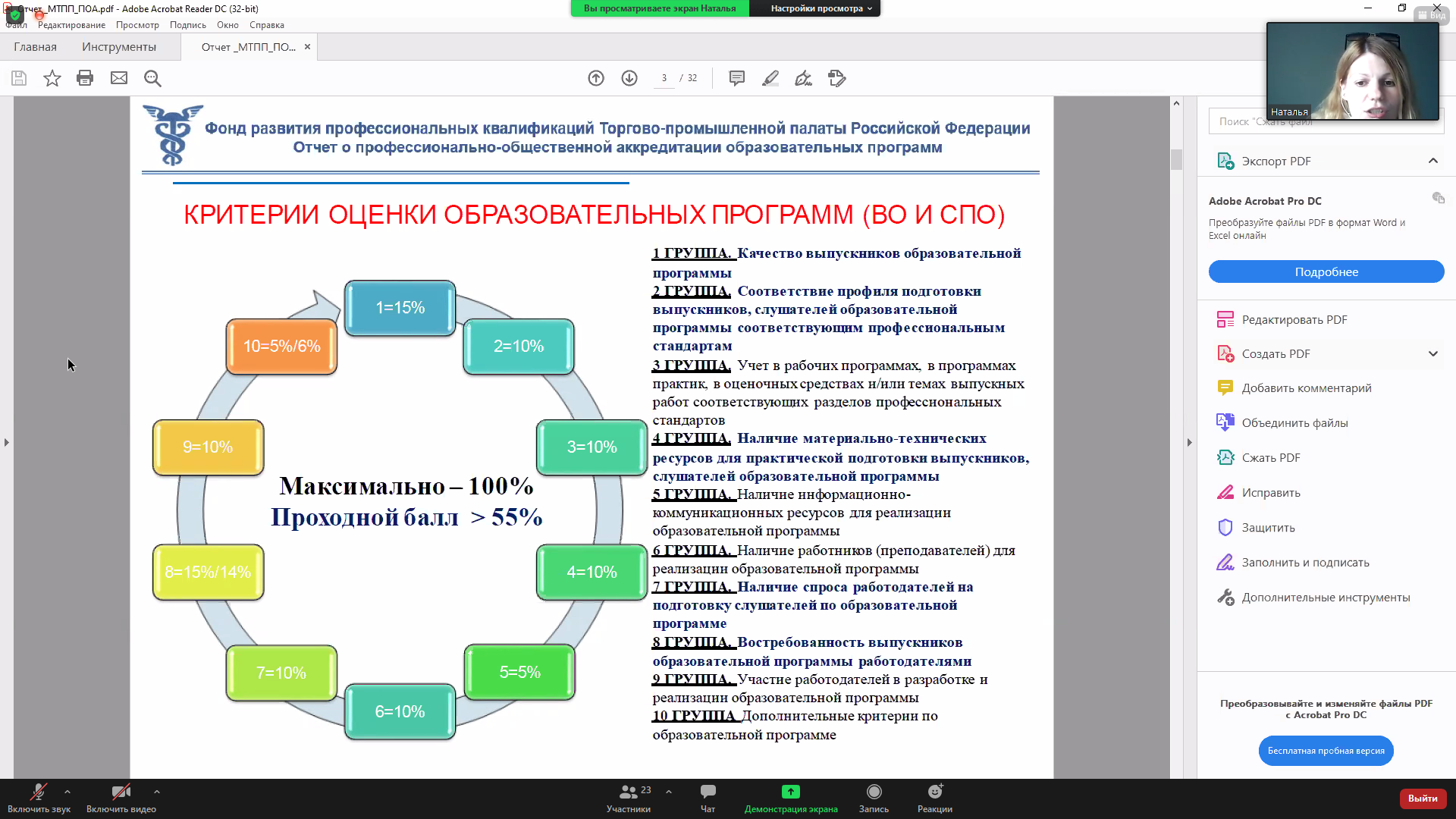 Ответственный секретарь Аккредитационного комитета ПОА ТПП РФ, руководитель образовательных программ и профессионально-общественной аккредитации Фонда развития профессиональных квалификаций (ФРПК) ТПП РФ Наталья Сапронова подвела некоторые итоги проведения ПОА высших учебных заведений. Она осветила основные критерии, по которым происходит оценка ВУЗов, а также средних профессиональных образовательных (СПО) заведений и отметила их различия. Помимо этого, эксперт рассказала, что экспертиза проводится в два этапа: сначала организуется камеральная проверка, а потом – выездная, в ходе которой анализируется в том числе и материально-техническая база образовательного заведения. По итогам определяется количество полученных баллов и даются рекомендации по усовершенствованию образовательной программы.