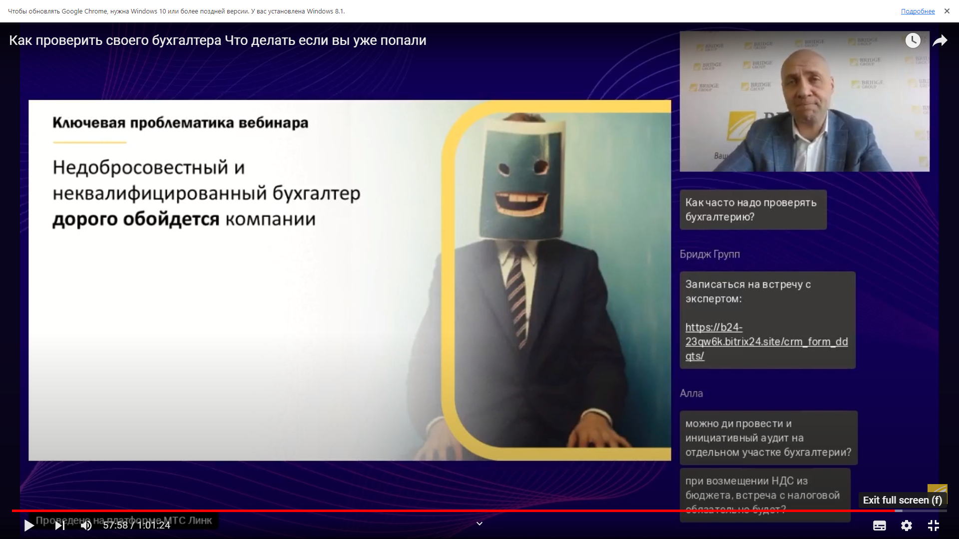 В заключение вебинара спикер представил слушателям памятку по «допросам» в налоговой инспекции и подчеркнул, что недобросовестный и неквалифицированный бухгалтер дорого обойдется компании. Он также попросил слушателей присылать интересующие их темы для будущих вебинаров.