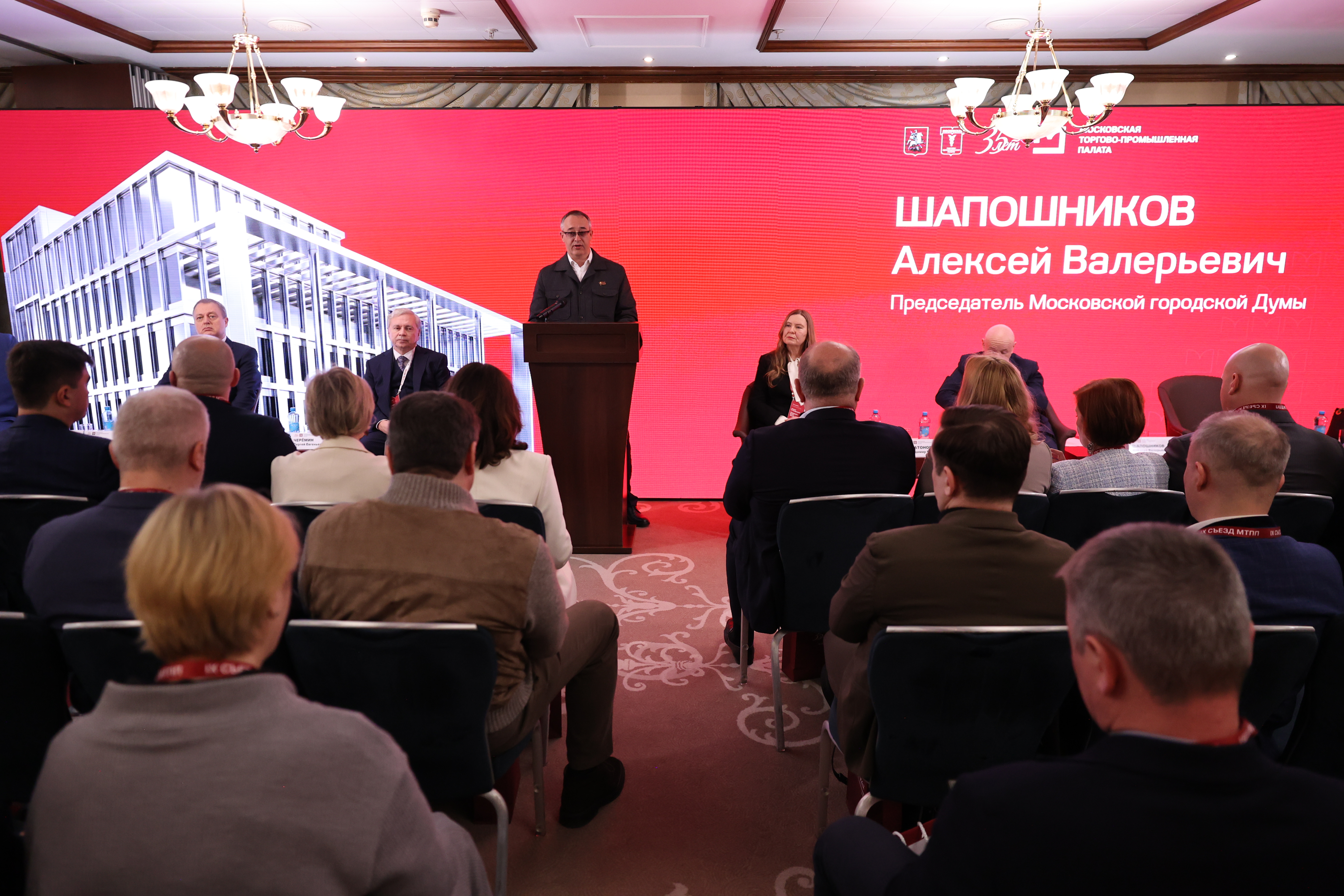 С приветствиями на Съезде также выступили председатель Московской городской Думы Алексей Шапошников, министр Правительства Москвы, руководитель Департамента внешнеэкономических и международных связей города Москвы Сергей Черёмин, вице‑президент Торгово‑промышленной палаты Российской Федерации Илья Зубков, Уполномоченный по защите прав предпринимателей в городе Москве Татьяна Сизова и генеральный директор АО «Экспоцентр» Максим Фатеев. Алексей Шапошников, в частности, отметил: «Московская торгово‑промышленная палата играет особую роль. Она выступает важной площадкой во взаимодействии бизнеса и власти, обеспечивая диалог, выработку согласованных решений и представление интересов предпринимательского сообщества. Благодаря системному сотрудничеству города и предпринимательского сообщества столичная экономика демонстрирует устойчивость и сохраняет высокий потенциал для роста».
