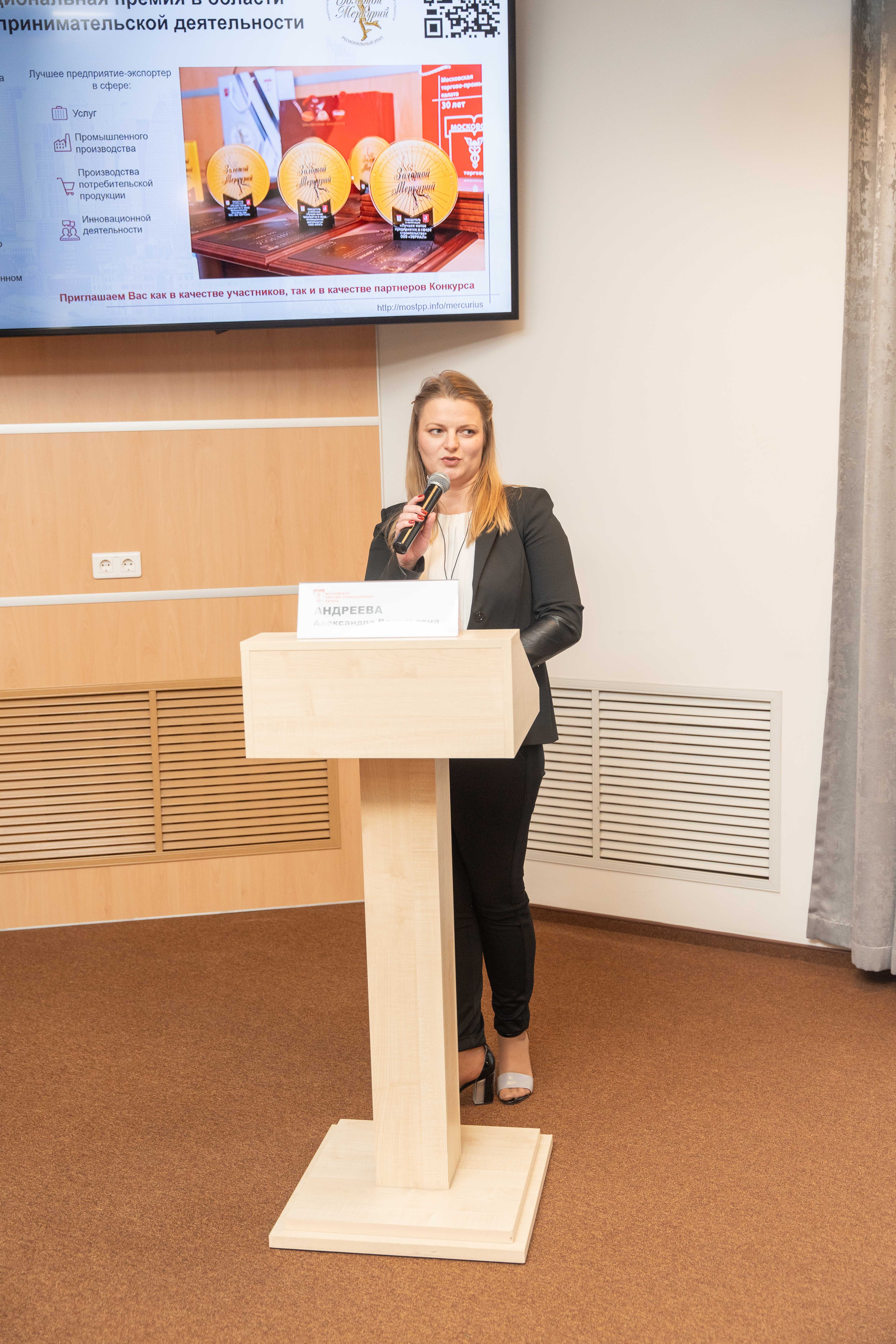 О Национальной премии в области предпринимательской деятельности «Золотой Меркурий» рассказала заместитель директора Департамента по работе с предпринимателями и содействию предпринимательским инициативам Александра Андреева. Она анонсировала региональный этап конкурса, пояснив, почему это важно и интересно для предпринимателей. «Будем рады видеть вас в числе участников. Не волнуйтесь, мы будем максимально сопровождать вас в движении к «Золотому Меркурию», - поддержала потенциальных конкурсантов Александра Андреева.