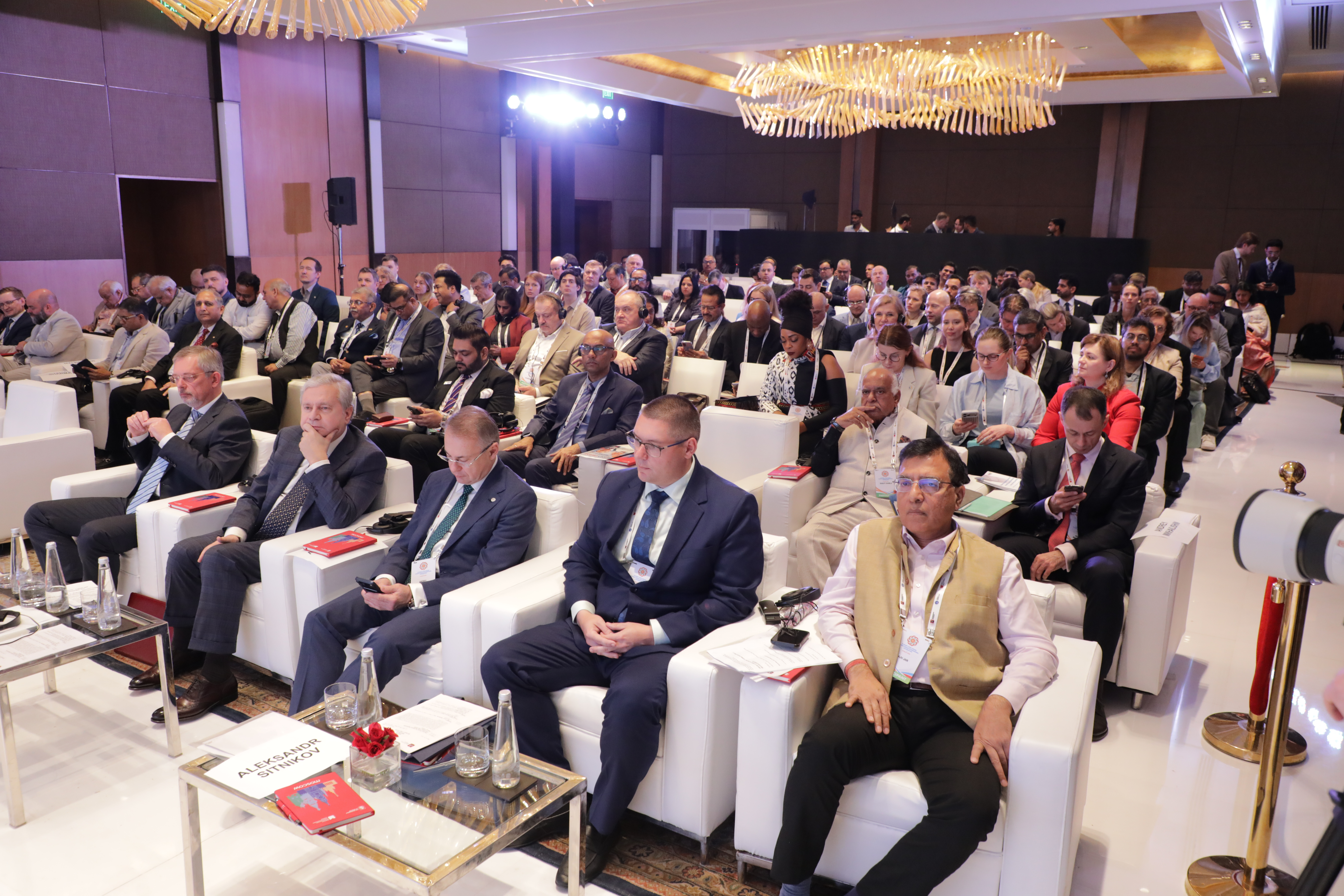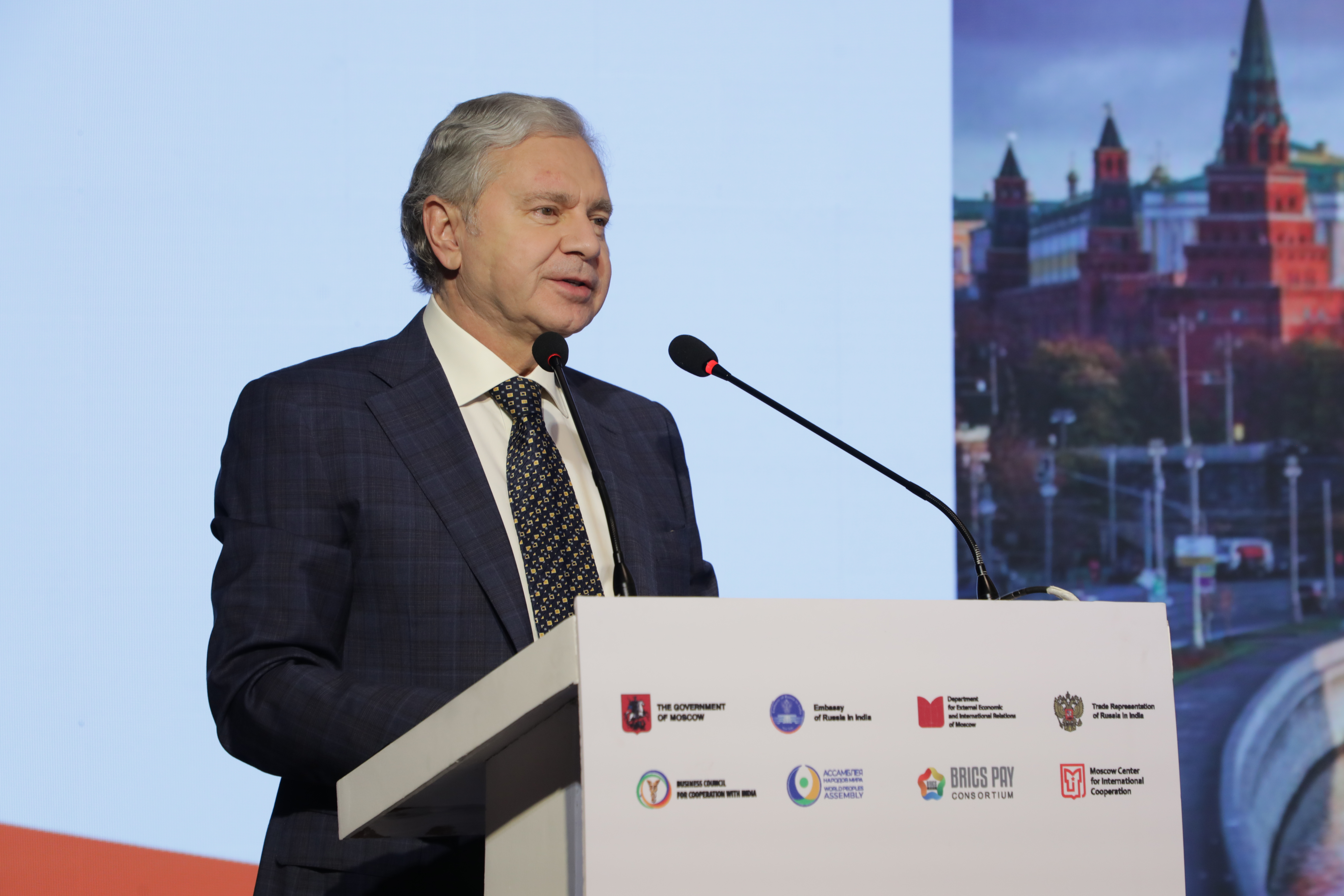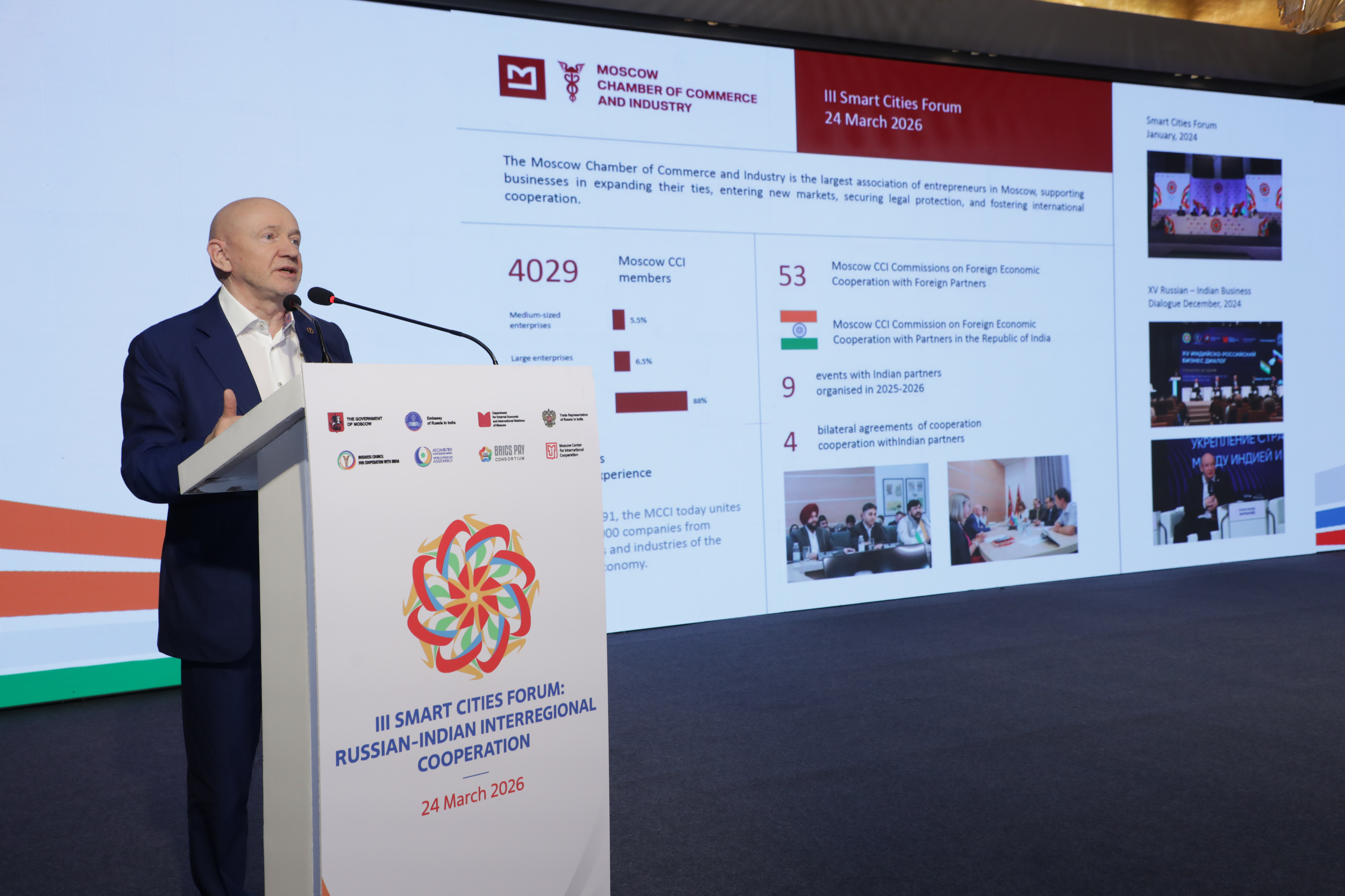 В своем выступлении Платонов подробно остановился на значении российско-индийских отношений в текущих геополитических условиях. Он отметил роль торгово-промышленных палат, существующих более 400 лет, в поддержании экономических связей в периоды кризисов. Комиссия МТПП по внешнеэкономическому взаимодействию с Индией за последние два года провела 9 мероприятий с индийскими партнерами. В настоящее время действуют четыре межпалатных соглашения: с Торговой палатой Бхарат (заключено в 2019 году), Всеиндийской торгово-промышленной палатой, Федерацией экспортеров Индии и Торговой палатой штата Раджастхан. На этой основе реализуются совместные проекты в фармацевтике, химической промышленности, нефтегазовом секторе, машиностроении и высоких технологиях. Московские компании участвуют в Российско-Индийском бизнес-диалоге, форумах БРИКС и отраслевых выставках.