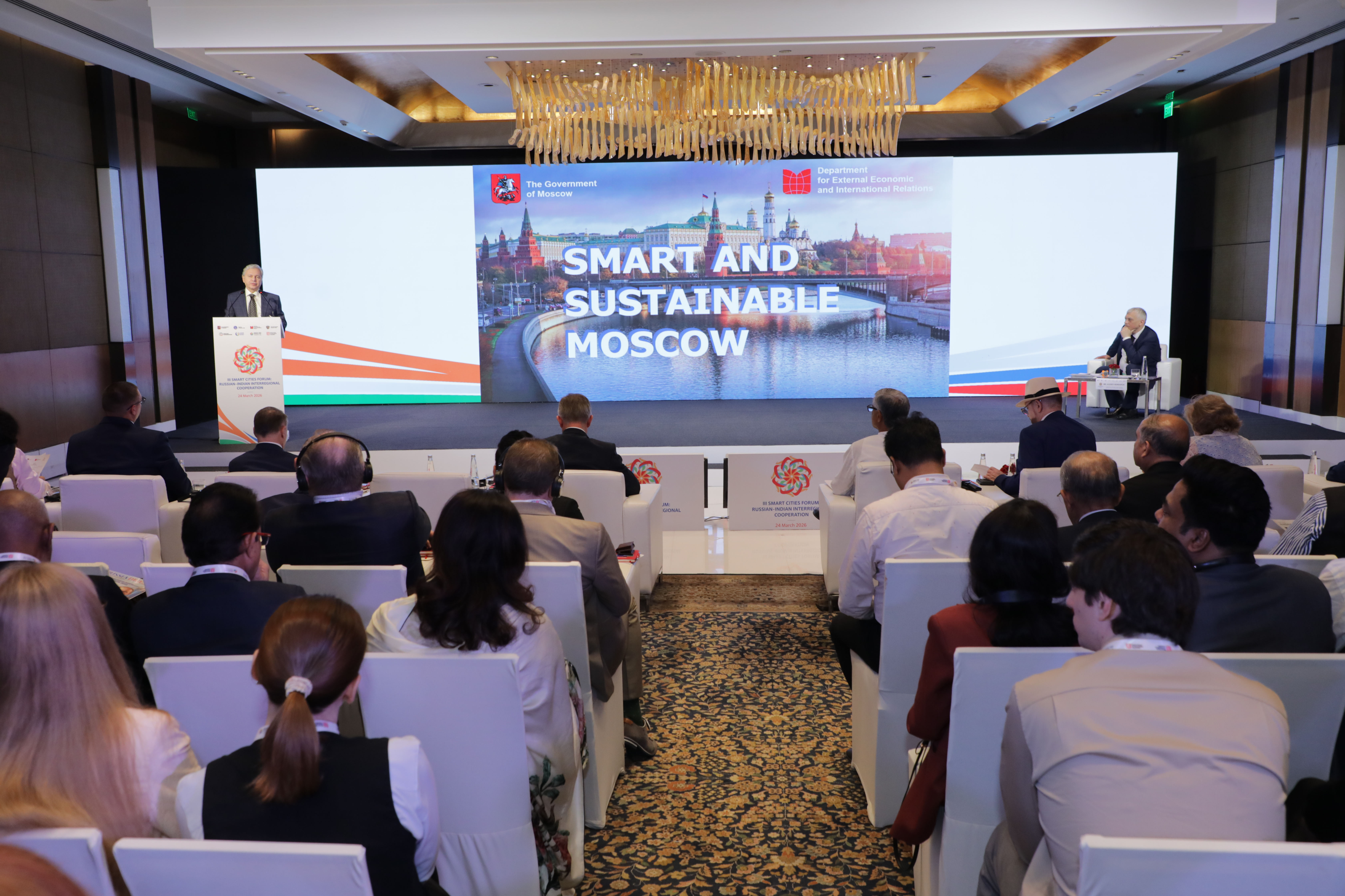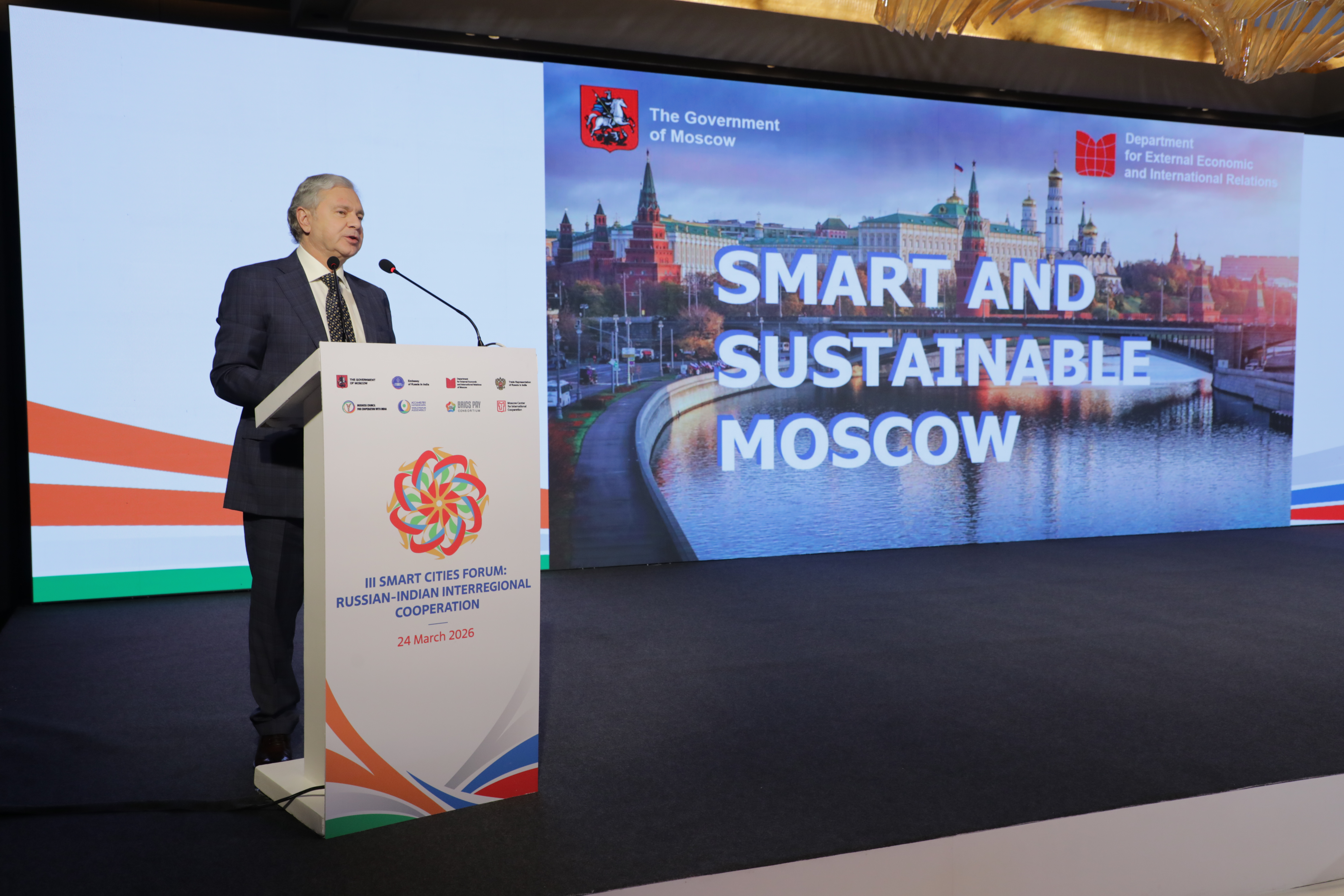 Делегация прибыла в Нью-Дели 23 марта и сразу включилась в программу Smart Cities India Expo 2026. На стенде Москвы компании «СберСити», «ВижнЛабс», «Логос», группа «Элемент», «Базальт СПО», Московский физико-технический институт, Финансовый университет и «Оксиджен Технолоджиес Рус» представили свои разработки в области искусственного интеллекта, анализа больших данных, систем управления городской инфраструктурой и безопасности. Возглавлявший делегацию Министр Правительства Москвы, руководитель Департамента внешнеэкономических и международных связей столицы Сергей Черёмин в ходе экспозиции отметил лидерство Москвы в применении ИИ и больших данных для создания умных городов, подчеркнув вклад этих технологий в повседневное управление столицей.