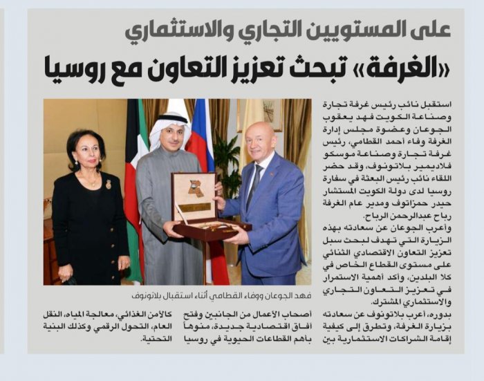 В ходе официальной встречи президента МТПП (представлявшего также всю систему Торгово-промышленных палат России) с заместителем министра иностранных дел Кувейта Мансуром Аядом Аль-Отайби были рассмотрены направления двустороннего сотрудничества между двумя дружественными странами и пути его развития, особенно в торгово-экономической сфере.