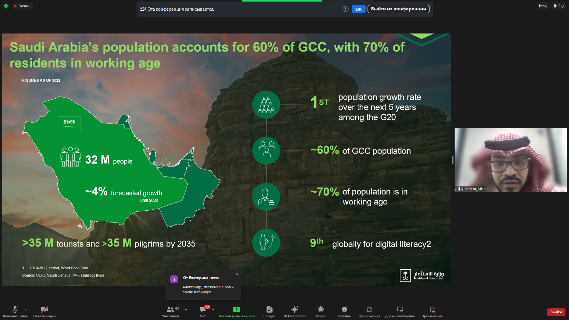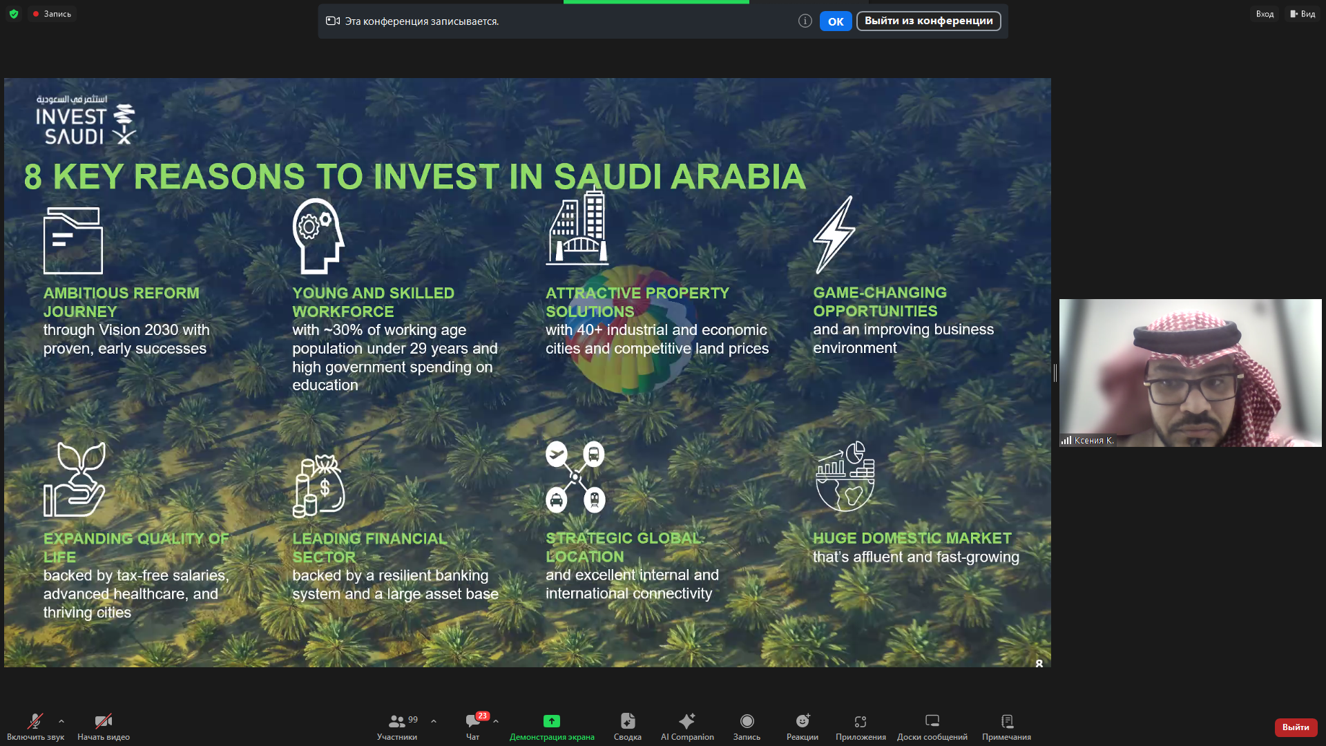 В завершение вебинара Алексей Бусев поблагодарил всех его участников, попросил направлять вопросы, на которые пообещал ответить во время следующих мероприятий. Также он заверил слушателей в помощи с подготовкой и выводом компаний на рынок Саудовской Аравии.