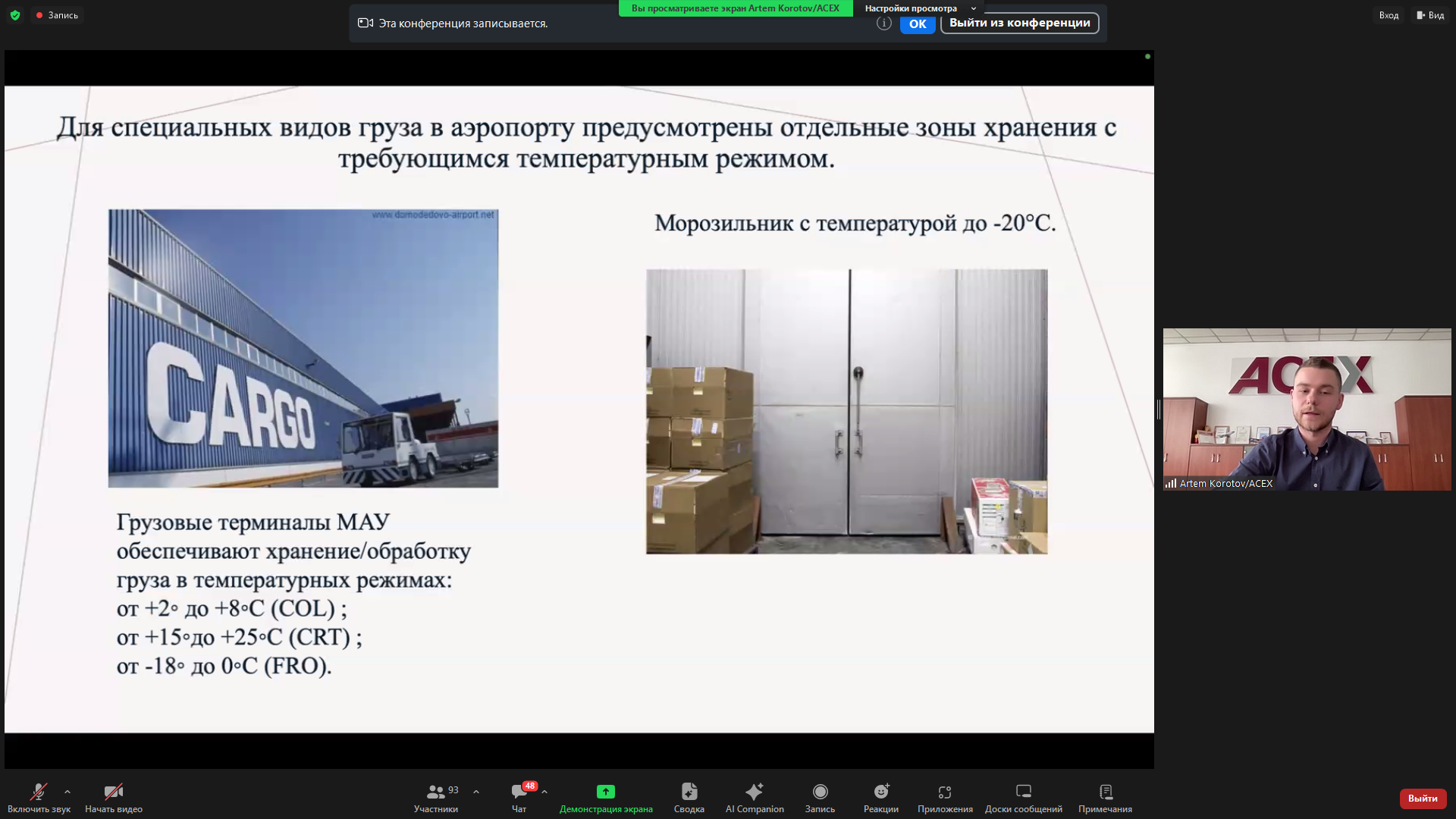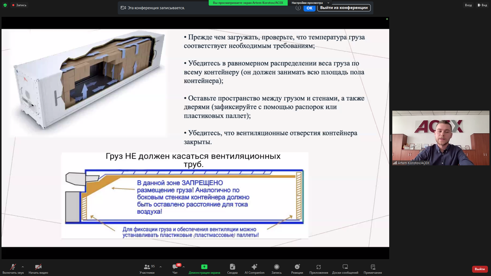 Руководитель отдела развития бизнеса компании ACEX Group Артем Коротов выступил с докладом «Логистическая инфраструктура и ключевые пути поставок продукции из России в страны Персидского залива». Он рассказал об основных маршрутах экспорта из России в страны Персидского залива, рефрижераторных контейнерах и требованиях к их загрузке при морских перевозках; компаниях, осуществляющих перевозку грузов в страны Персидского залива, и особенностях соблюдения при транспортировке температурного режима для грузов; специальном оборудовании для обеспечения температурного режима для груза. Спикер также подробно остановился на документальном сопровождении грузов во время пути.
