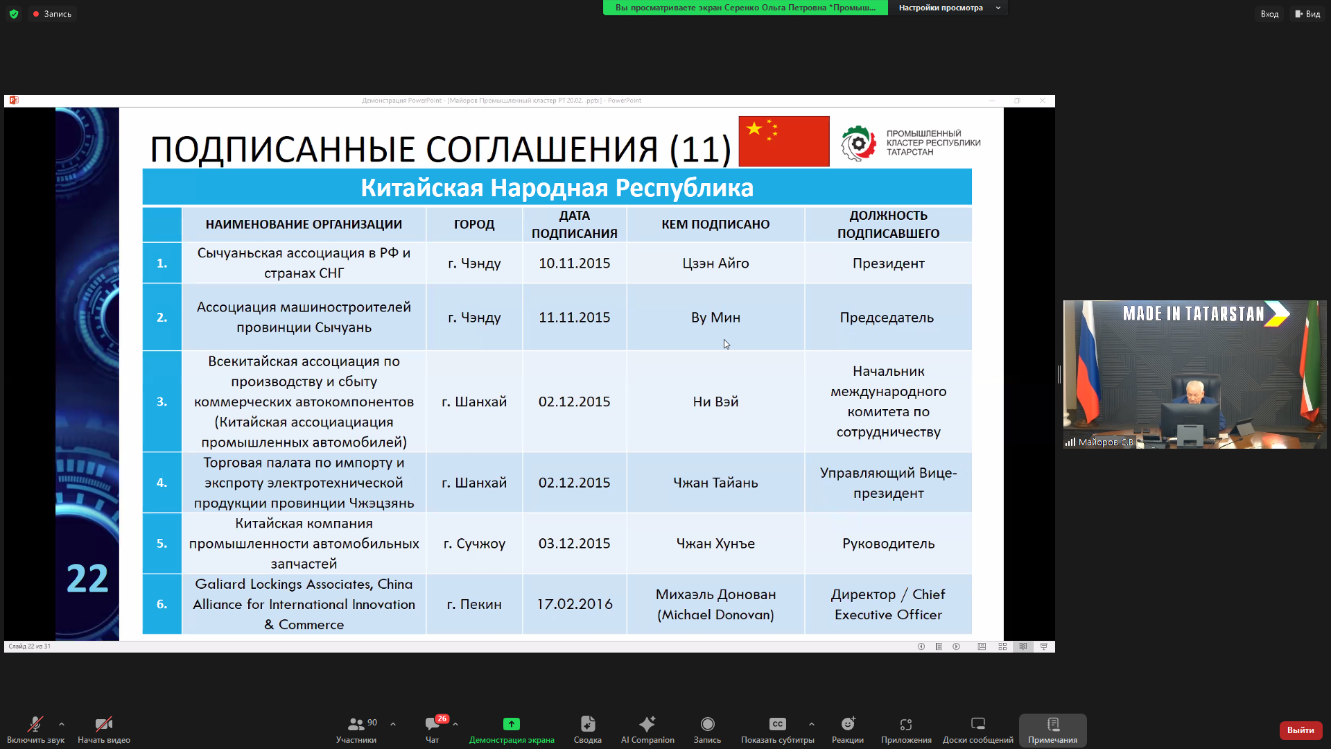 Председатель правления Промышленного кластера Республики Татарстан Сергей Майоров рассказал о вкладе РТ в российскую экономику и ее Промышленном кластере, образованном в 2015 году. Участниками кластера являются более 900 организаций, создавших более 120 тыс. рабочих мест, в его составе действуют 23 отраслевых комитета. Спикер представил процесс сопровождения в кластере инвестиционных проектов, продвижения продукции и услуг, 20 приоритетных проектов, план мероприятий Промышленного кластера на 2025 год, а также проинформировал о подписании соглашений о сотрудничестве с партнерами из 34 стран, в том числе с КНР.