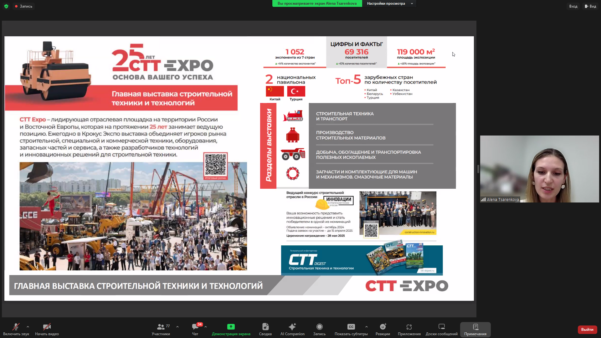 Заместитель генерального директора по развитию компании Sigma Expo Group Алена Царенкова выступила на тему «CTT Expo как отражение реалий машиностроения на российском рынке». Она рассказала об этой выставке, проводимой в течение 25 лет, и ее участниках, в числе которых лидируют компании из КНР. Спикер также представила слушателям еще три отраслевых выставки – Comvex, CTO Expo, Logistika Expo, в которых также участвуют китайские производители: рассказала о выставках в Китае, с которыми у компании выстроены партнерские связи. Алена Царенкова отметила готовность сотрудничать с Межрегиональной биржей спецтехники и Международным форумом «РОСТКИ: Россия и Китай – взаимовыгодное сотрудничество».