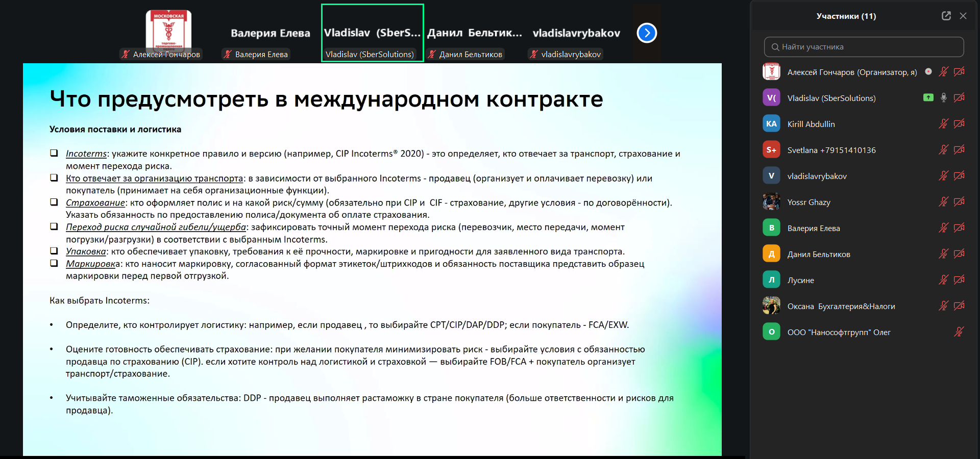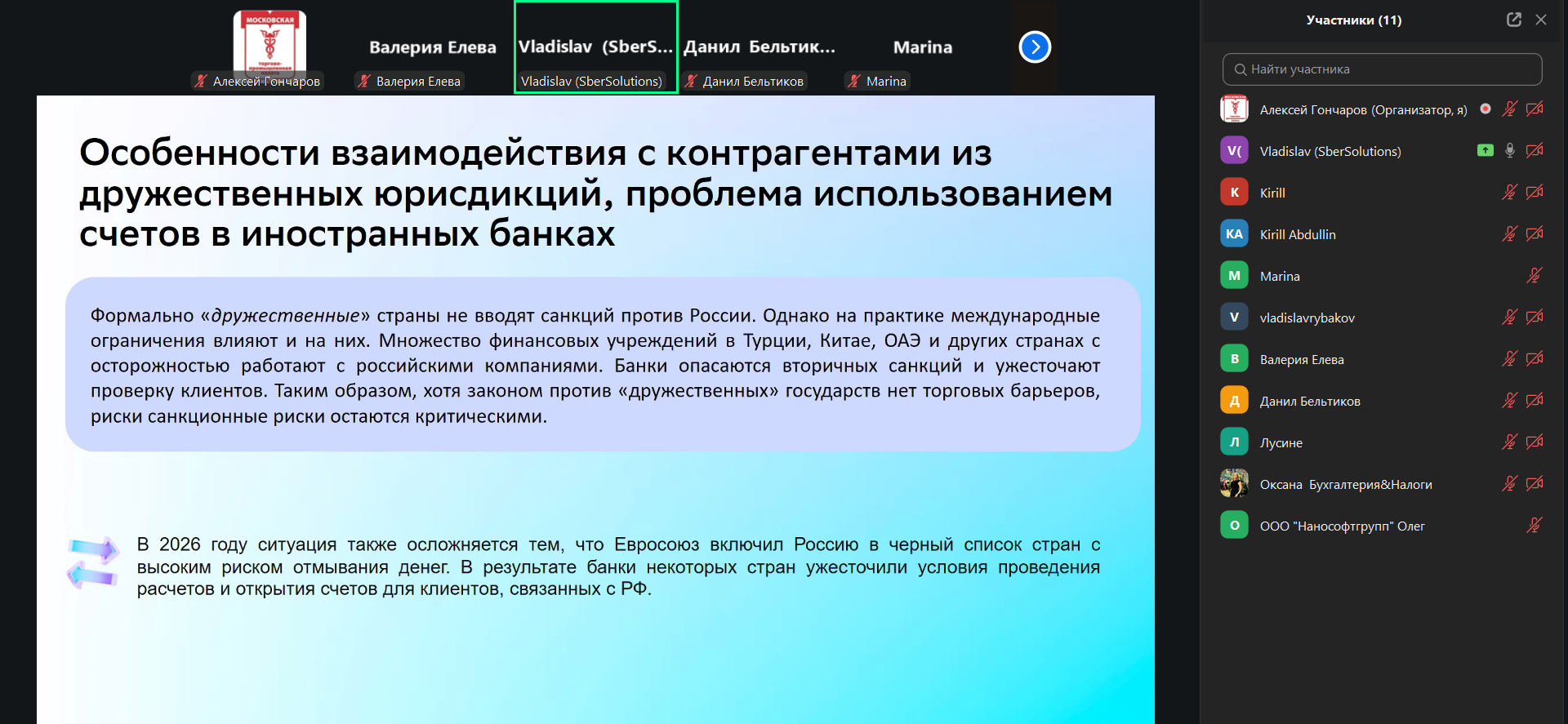 Главный юрист ООО «СберРешения» Владислав Гаврилов выступил на тему «Юридические и организационные инструменты для безопасной ВЭД. Структура безопасного внешнеторгового контракта». Эксперт рассказал, какие бизнес-процессы необходимо внедрить в компании для обеспечения соблюдения законодательства и подробно осветил юридические, операционные, контрактные и иные риски, которые могут возникнуть в рамках внешнеэкономической деятельности. Также спикер поделился опытом взаимодействия с партнерами из дружественных юрисдикций, осветив актуальные аспекты работы с финансовыми учреждениями Турции, Китая, ОАЭ, Армении, Сербии, Таджикистана, Казахстана и Омана. В рамках практической части своего выступления Владислав Гаврилов разобрал структуру договора с зарубежным поставщиком и рассказал, какие условия необходимо предусмотреть в документе для того, чтобы снизить правовые и санкционные риски.