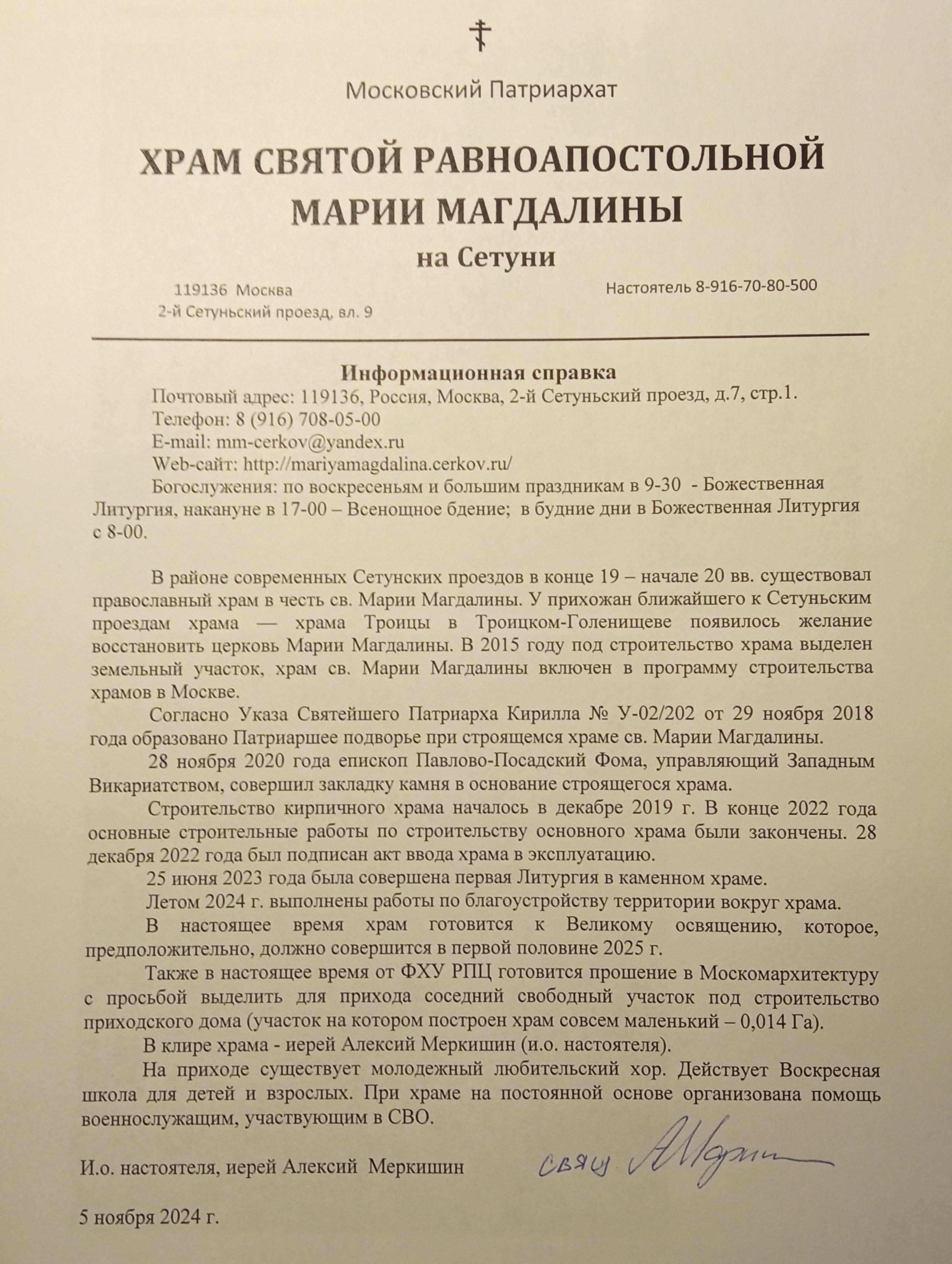 Исполняющий обязанности настоятеля: иерей Алексей Меркишин 8 (916) 708-05-00